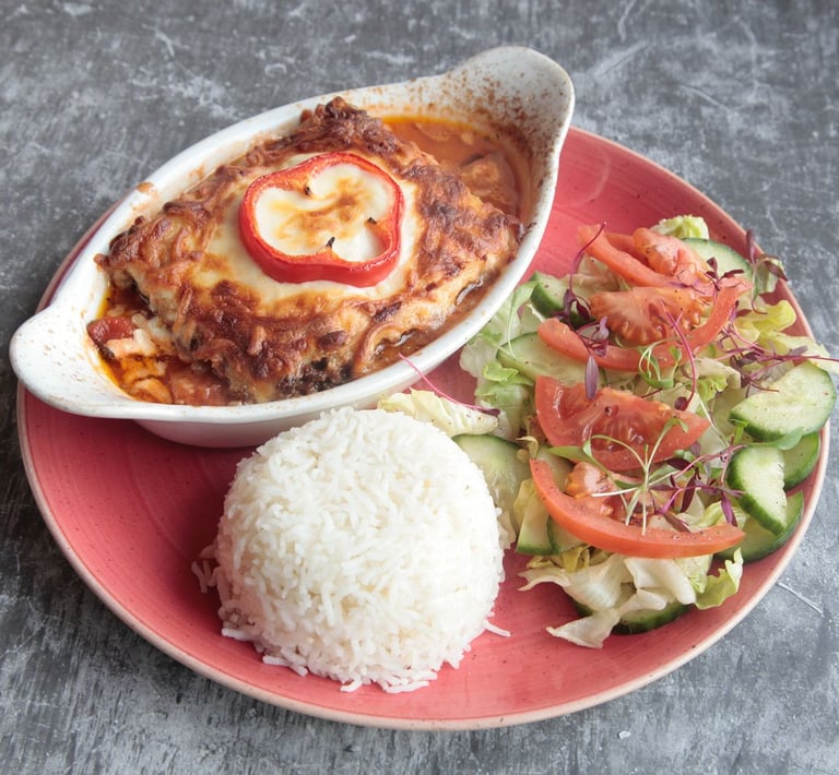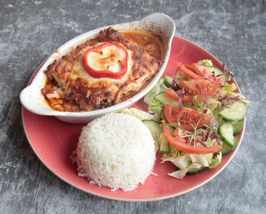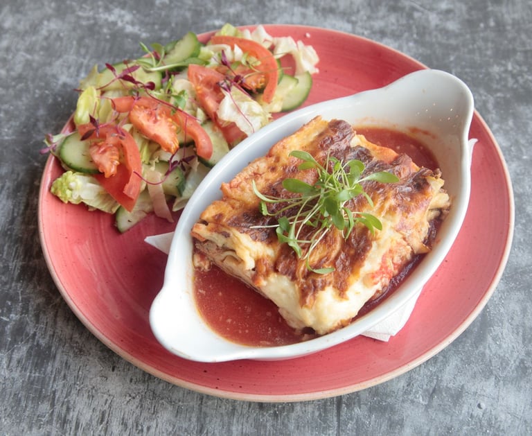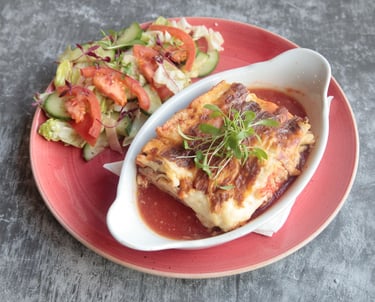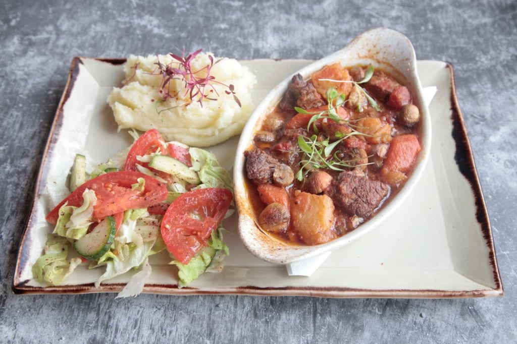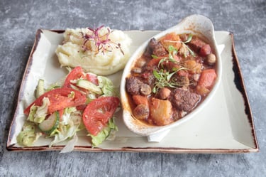 A classic French dish featuring slow cooked beef stewed with pearl onions carrots and mushrooms in red wine, served with mashed potatoes and house salad.