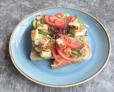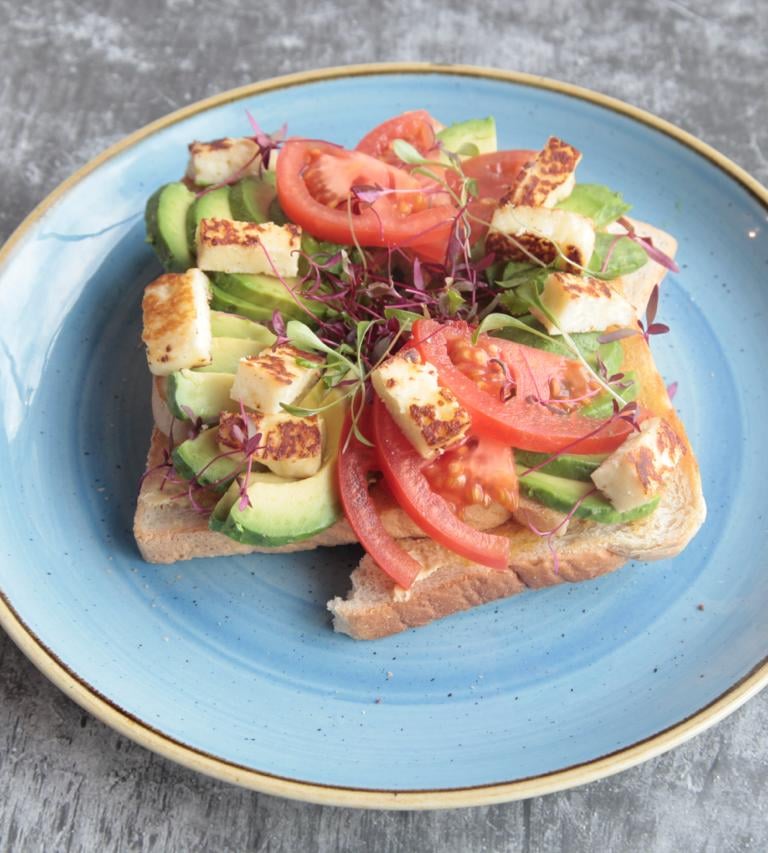 Seasoned smashed avocado topped with fresh tomato, grilled halloumi on brown toast
